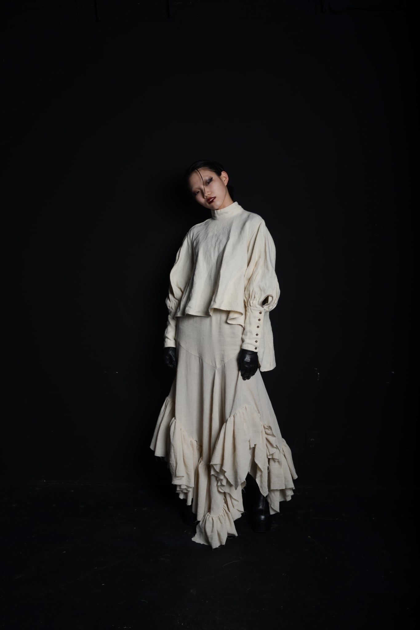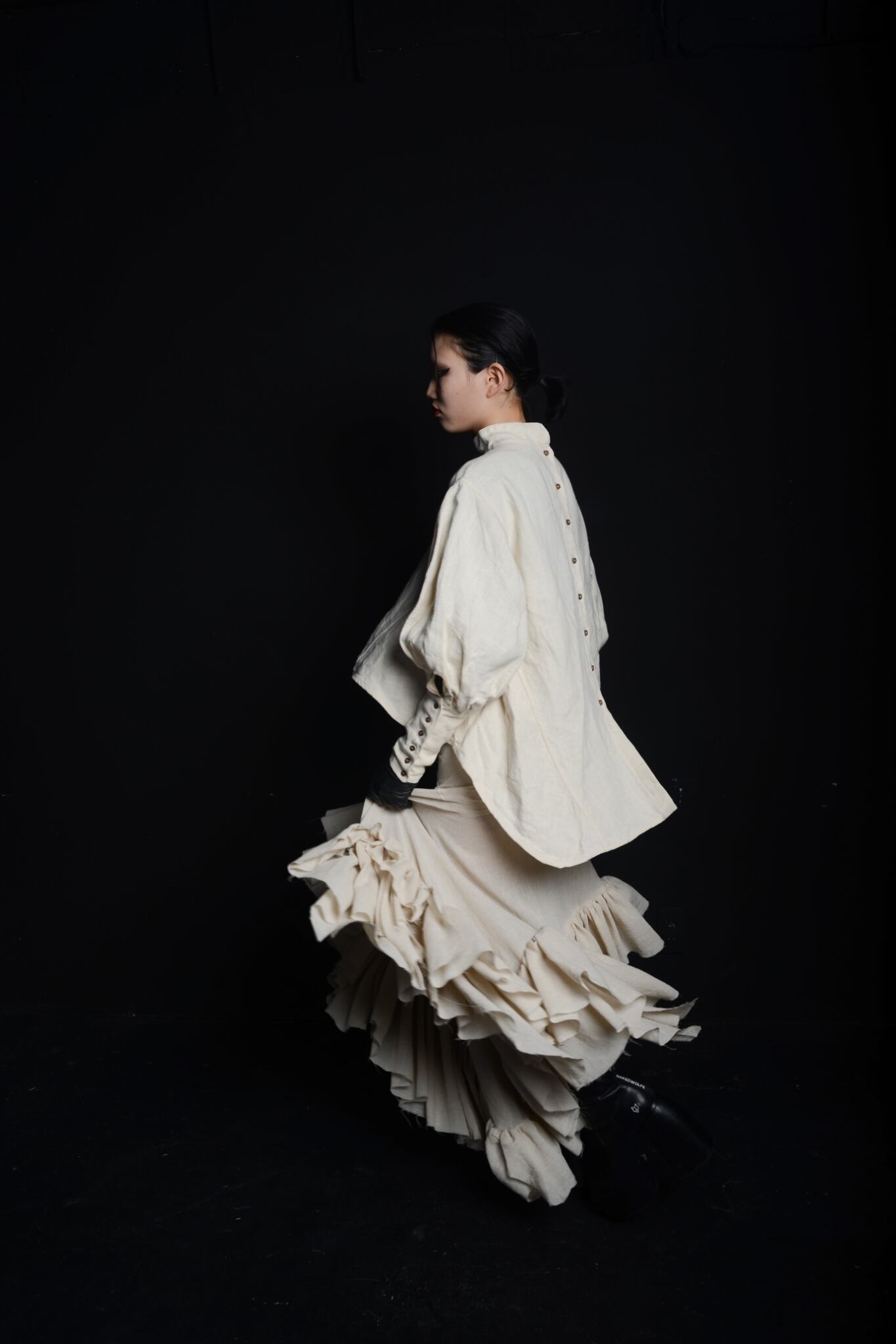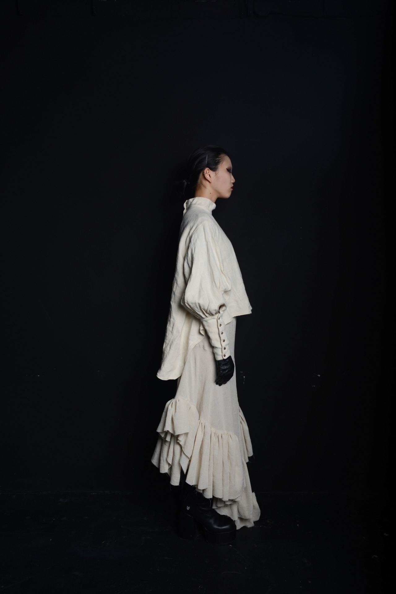 沢山の展開量のおかげでdressのようなボリューム感があり、歩く度にフリルが揺れ躍動感のある仕上がりです。アシンメトリーなデザインで360°どこから見ても違う為、どこを前にしても着用することが可能です。